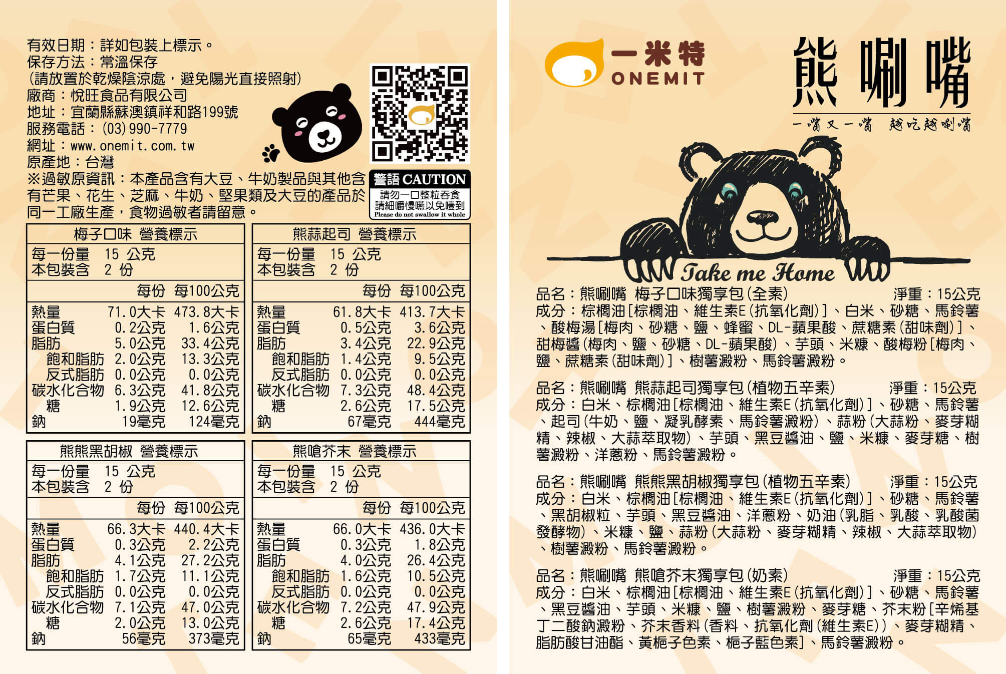 熊唰嘴 梅子口味獨享包-棕櫚油[棕櫚油、維生素E(抗氧化劑)]、白米、砂糖、馬鈴薯、酸梅湯[梅肉、砂糖、鹽、蜂蜜、DL-蘋果酸、蔗糖素(甜味劑)]、甜梅醬(梅肉、鹽、砂糖、DL-蘋果酸)、芋頭、米糠、酸梅粉[梅肉、鹽、蔗糖素(甜味劑)]、樹薯澱粉、馬鈴薯澱粉