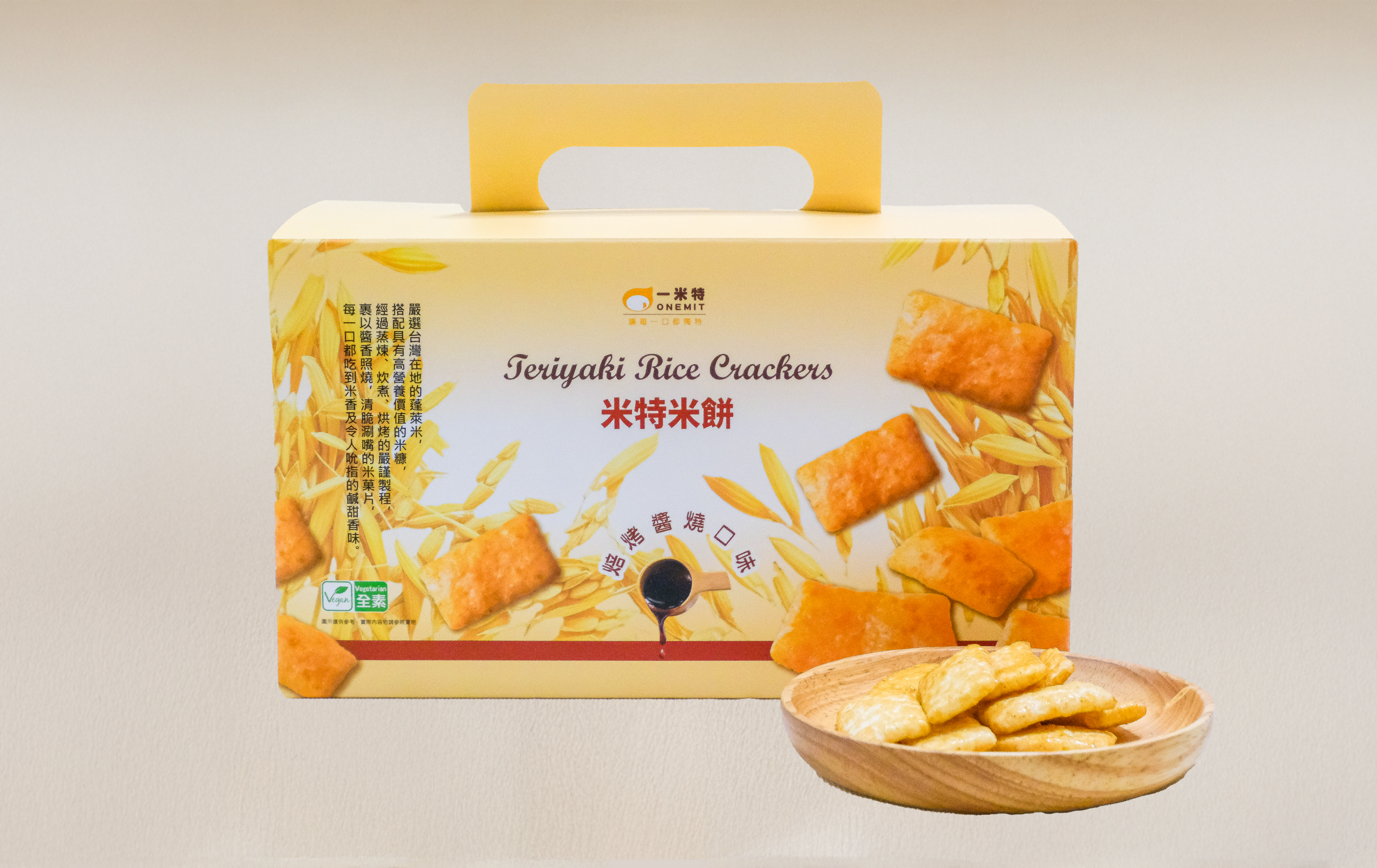嚴選台灣在地的蓬萊米,搭配具有高營養價值的米糠,經過蒸煉、炊煮、烘烤的嚴謹製程,裹以獨特焙烤醬燒,清脆涮嘴的米菓片,每一口都吃到稻米香及令人吮指的鹹甜香味。