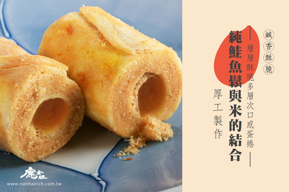 鮭魚鬆米蛋捲:純鮭魚鬆(鮭魚、植物油、糖、鹽、無麩質醬油)、雞蛋、蓬萊米粉、糖、大豆油、奶油、鹽
