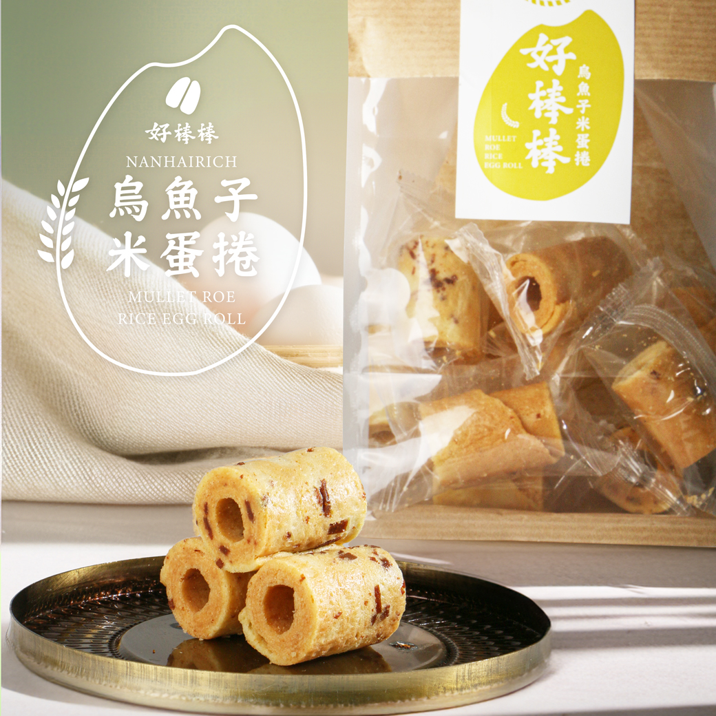 烏魚子米蛋捲:雞蛋、蓬萊米粉、糖、大豆油、奶油、烏魚子(烏魚子卵、鹽)
