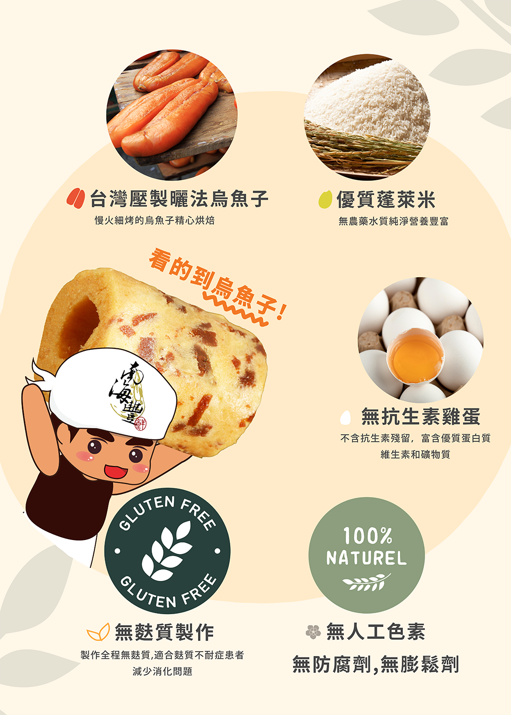 烏魚子米蛋捲:雞蛋、蓬萊米粉、糖、大豆油、奶油、烏魚子(烏魚卵、鹽)