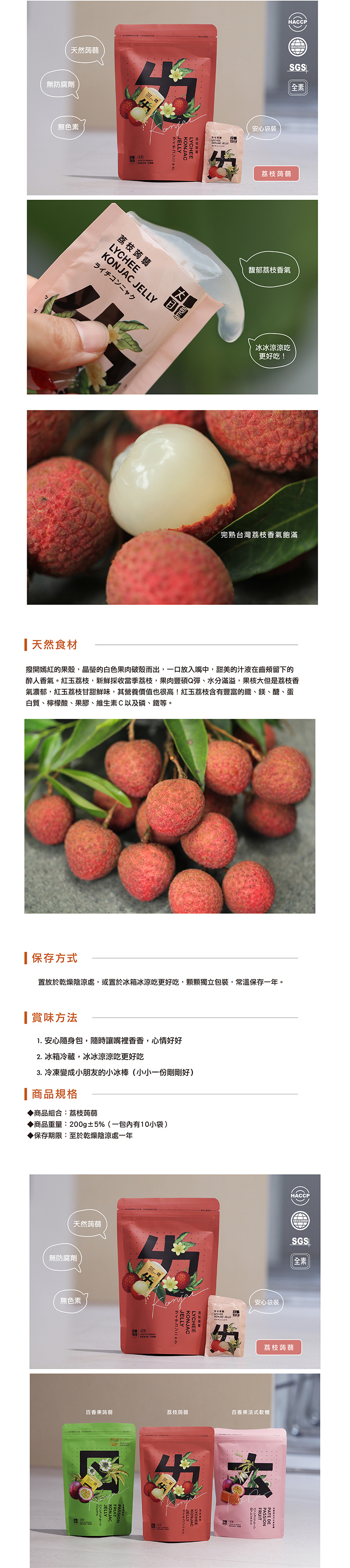 蒟蒻口感Q彈滑順,搭配荔枝特有的花果芳香,每一口都吃得到安心與用心。