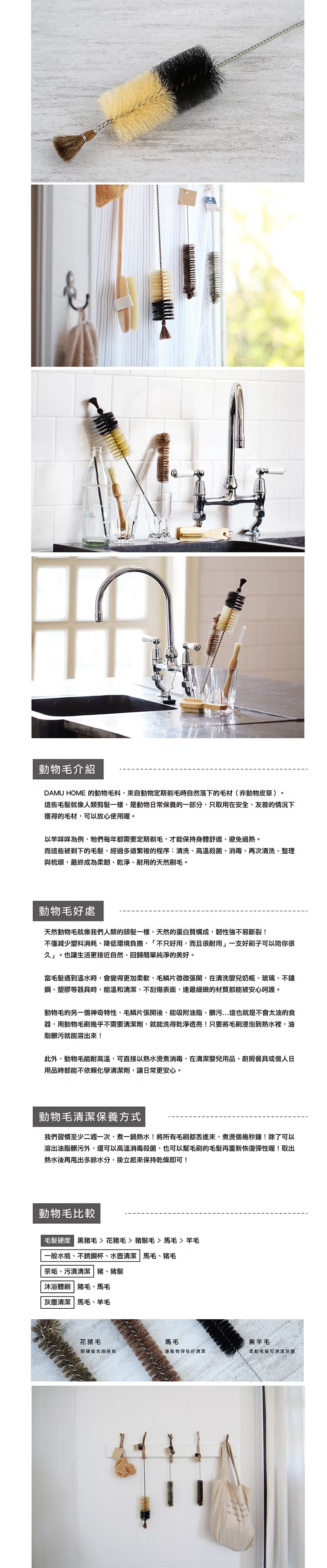 天然動物毛具優異清潔力,不需清潔劑即可去除油污,用熱水燙洗即可恢復潔淨與彈性,環保耐用,是廚房與日常清潔的好幫手。