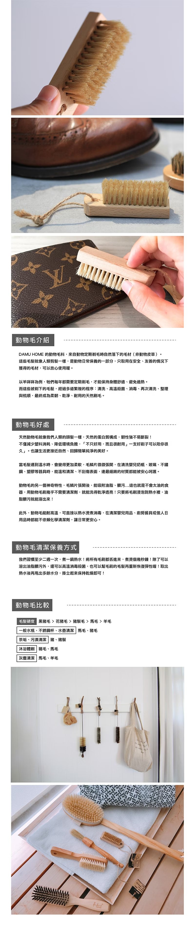 以天然豬鬃毛製成,毛質結實又富彈性,能深入皮革紋理間清除灰塵與污垢,同時溫柔不刮傷皮面。