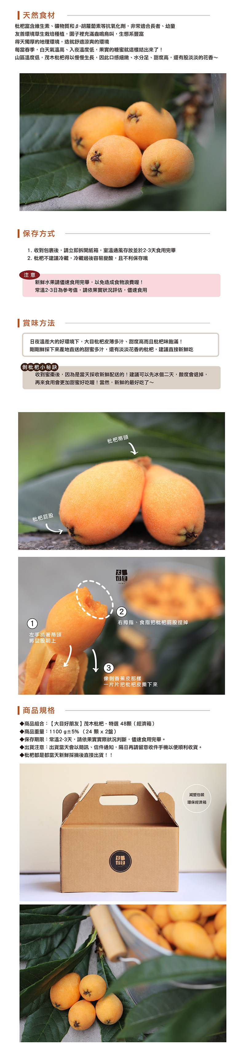 一收到就可以立刻品嚐,不需再放,常溫保存即可(枇杷會後熟,若再多放個1-2天果實也會更加更加甜美!)