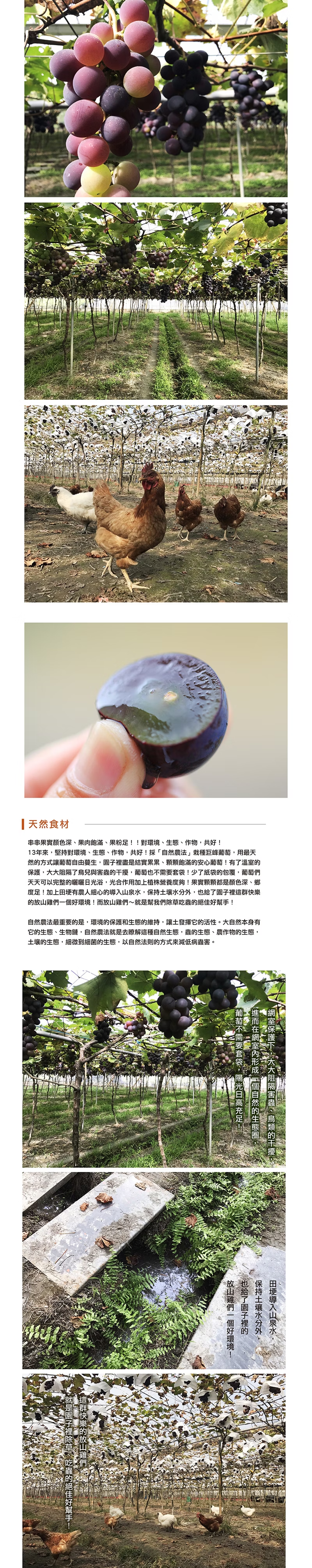 採「自然農法」栽種巨峰葡萄,用最天然的方式讓葡萄自由蔓生,園子裡盡是結實累累、顆顆飽滿的安心葡萄!有了溫室的保護,大大阻隔了鳥兒與害蟲的干擾,葡萄也不需要套袋!少了紙袋的包覆,葡萄們天天可以完整的曬曬日光浴,光合作用加上植株營養度夠!