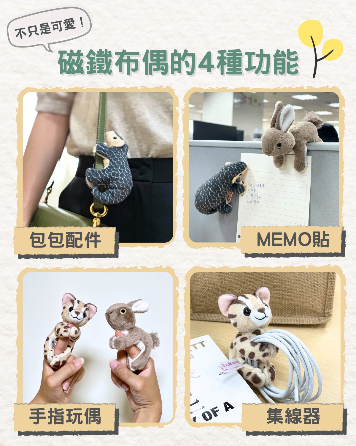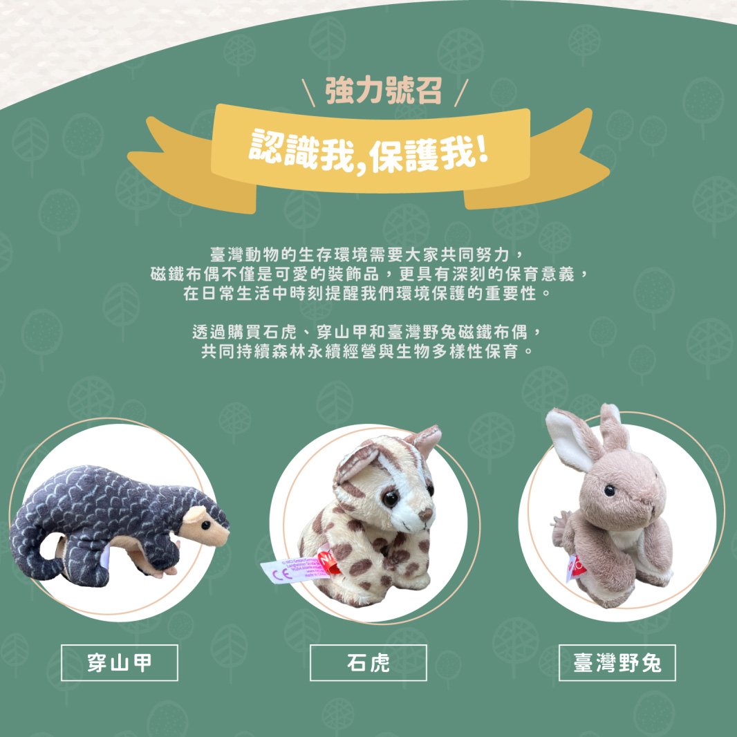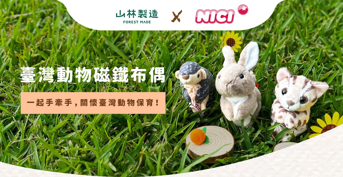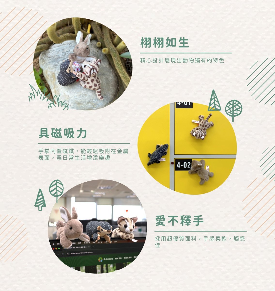 林業保育署的「山林製造」品牌與國際絨毛禮品品牌"NICI"聯名推出「臺灣動物磁鐵布偶」,精心設計展現動物獨有特色,手掌內置磁鐵,可吸附於金屬表面。「山林製造」商品收益將納入林務發展基金,用於支持森林遊樂區的營運與生態保育工作。