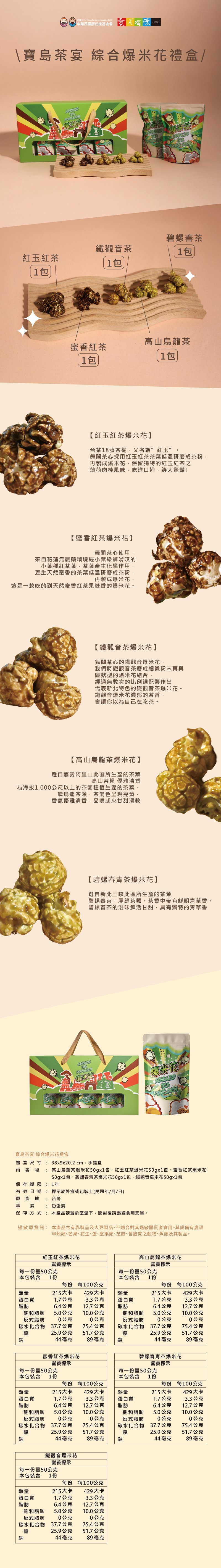 集結高山烏龍、紅玉紅茶、蜜香紅茶、碧螺春青茶與鐵觀音五款茶香爆米花,粒粒酥脆、層次分明,開蓋就是滿滿台灣茶韻。