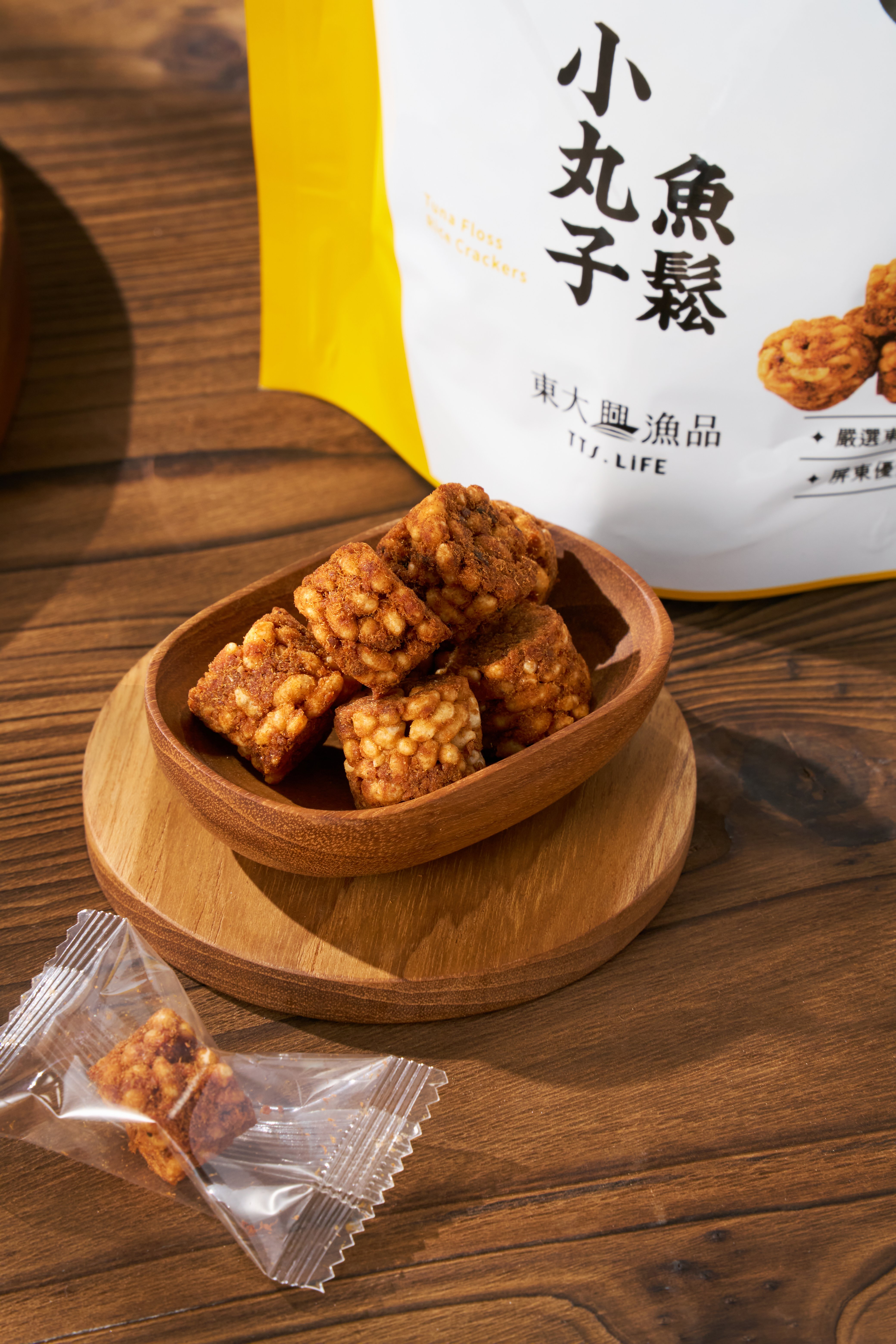 使用東港的旗魚鬆與屏東在地小農種植的米所製成的米果,