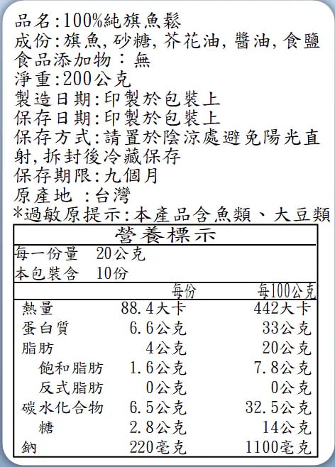成份:旗魚、砂糖、芥花油、醬油、食鹽