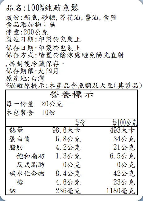 成份:鮪魚、砂糖、芥花油、醬油、食鹽