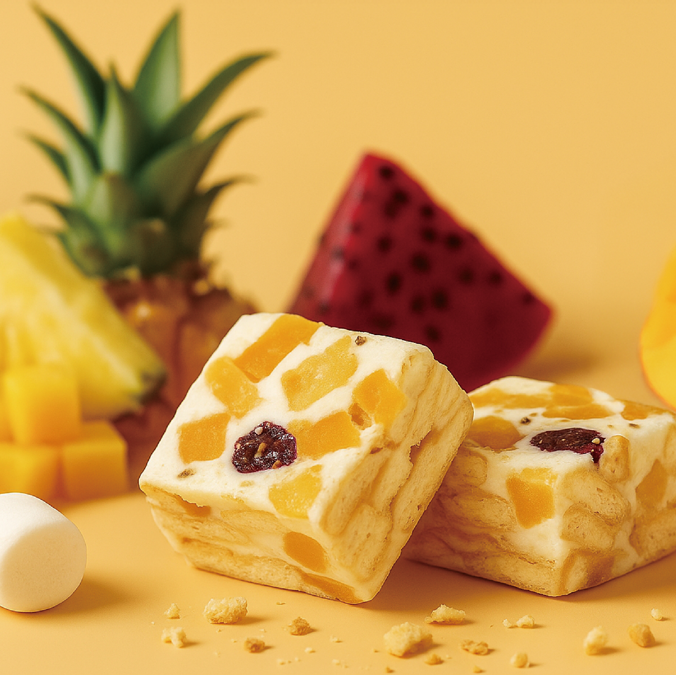 以台灣熱帶水果三重奏——芒果、鳳梨、火龍果,打造出獨特的南國風味雪Q餅!嚴選台灣水果製成果乾,融入細緻奶香的柔順口感,讓每一口都充滿陽光果香與綿密口感。這款雪Q餅不僅帶來豐富的酸甜層次,更讓熱帶水果的自然甜美在口中綻放。冷藏享受濃郁Q感!