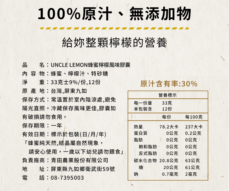 ★檸檬大叔加上嚴選蜂蜜,製作成一顆顆蜂蜜檸檬膠囊。外出攜帶方便,更適合在辦公室想隨手即飲的妳。