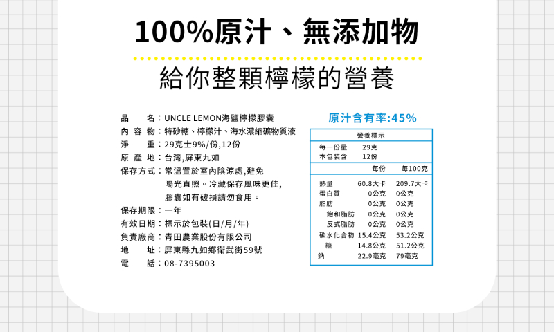 ★把妳們最喜愛的檸檬大叔加上臺鹽海洋鹼性離子海鹽,製作成一顆顆海鹽檸檬膠囊。外出攜帶方便,更適合在辦公室想隨手即飲的妳。
