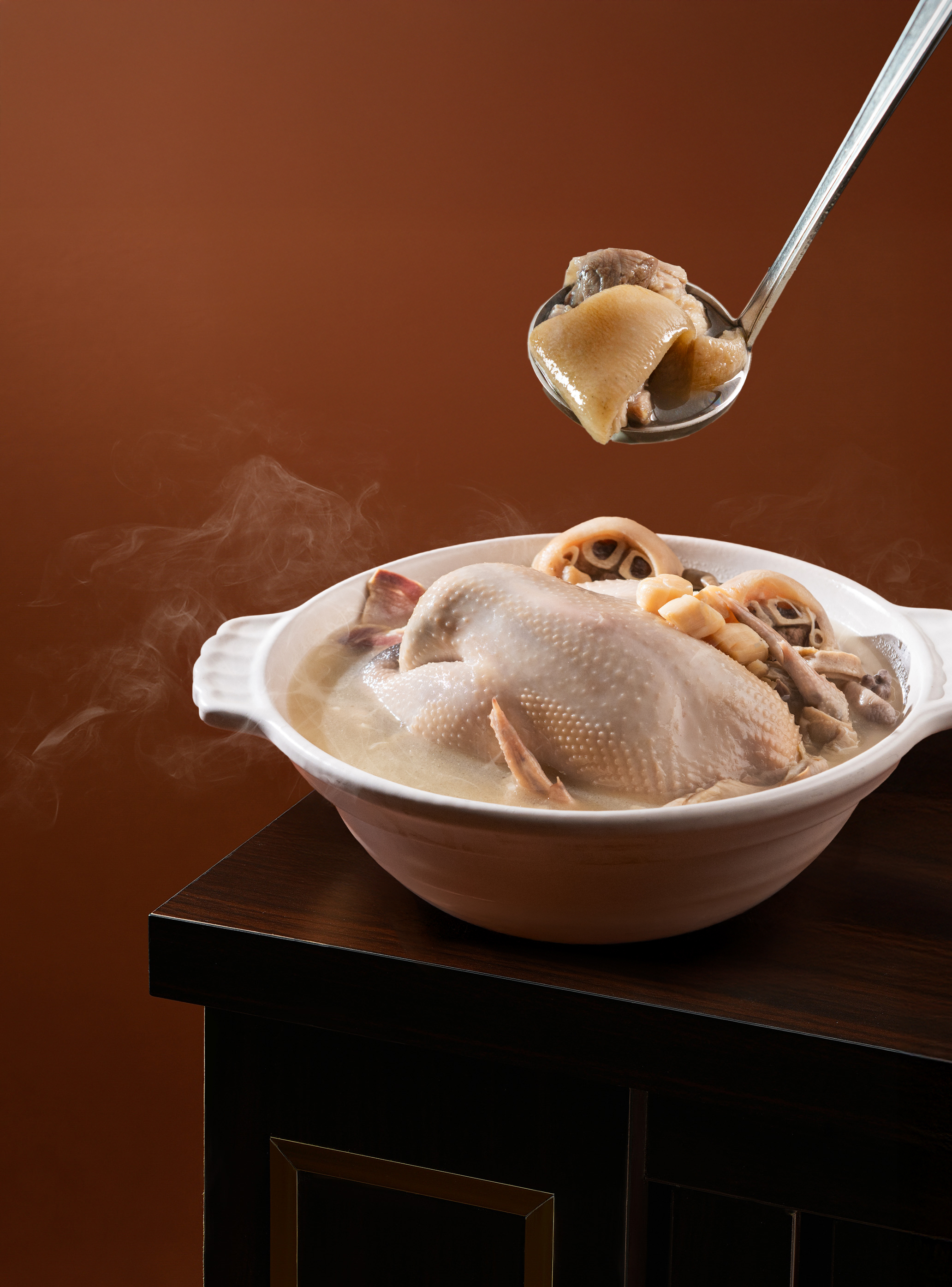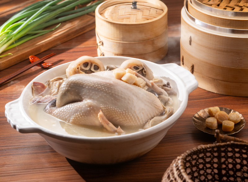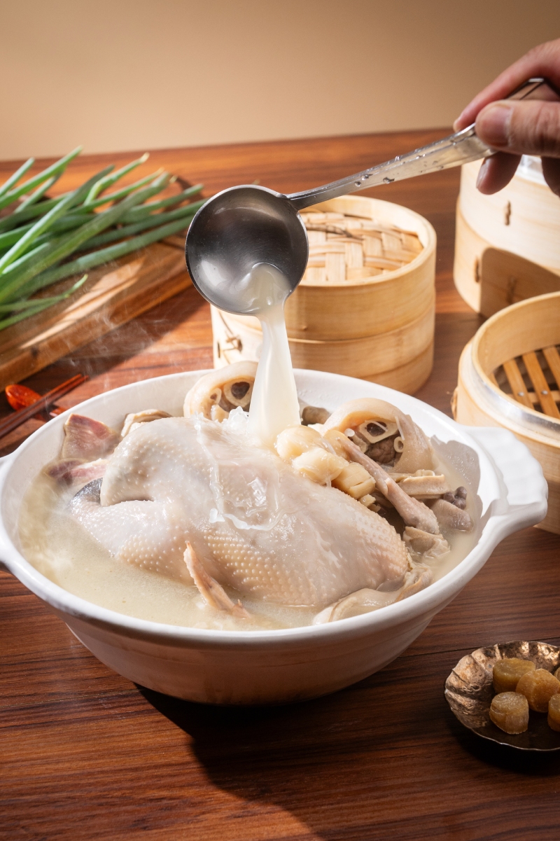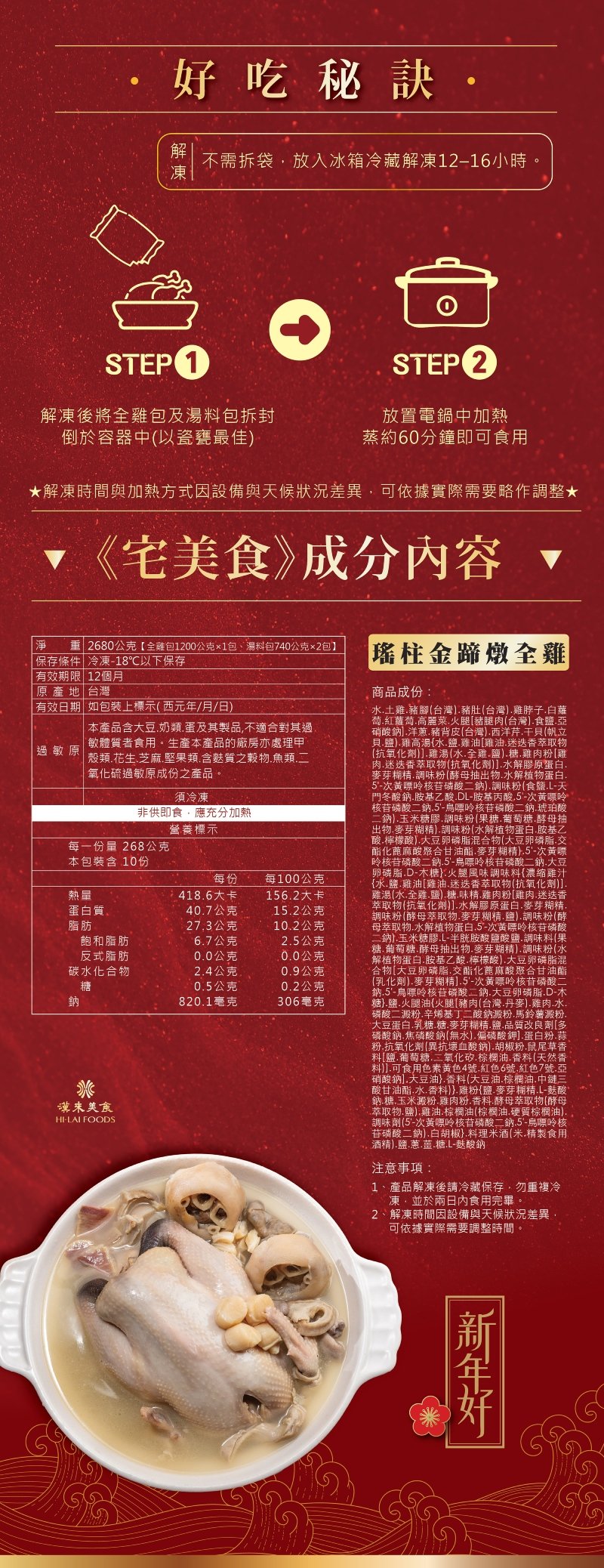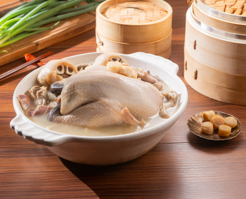 嚴選口感紮實富彈性的台灣土雞、搭配頂級瑤柱與金蹄,慢火細燉鎖住肉質鮮嫩與湯頭精華。每一口都能品嚐到瑤柱的甘甜、金蹄的膠質,以及濃郁的雞香,由漢來五星團隊研發監製,為佳節闔家團圓必吃的年菜首選。
