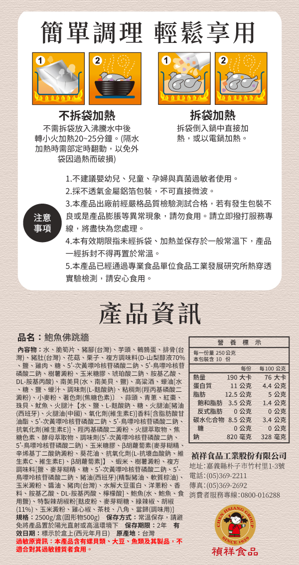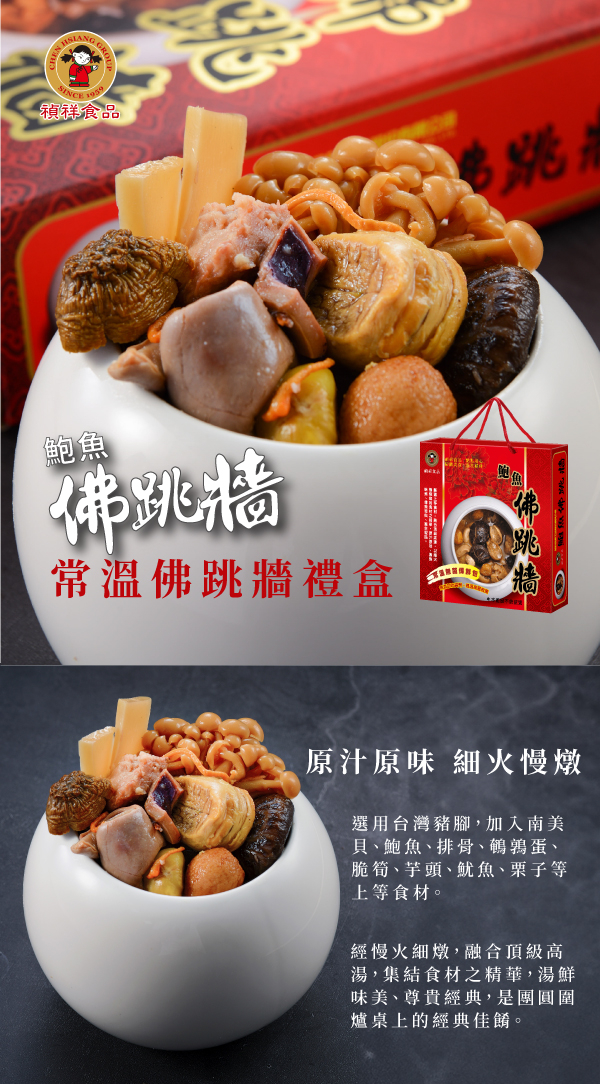 【商品成分】水、鮑魚(水、鮑魚、食用鹽)、南美貝(水、南美貝、鹽)、珠貝、魷魚、脆筍片、芋頭、鵪鶉蛋、排骨(台灣)、豬肚(台灣)、豬腳(台灣)、花菇、栗子、高粱酒、蠔油[水、糖、鹽、蠔汁、調味劑(L-麩酸鈉)、粘稠劑(羥丙基磷酸二澱粉)、小麥粉、著色劑(焦糖色素)]、蒜頭、青蔥、紅棗、蝦米、樹薯澱粉、特製辣胡椒粉[麩皮粉、麥芽糊糖、綠辣椒、胡椒(11%)、玉米澱粉、雞心椒、茶枝、八角、當歸(調味用)]、火腿汁【水、鹽、L-麩酸鈉、糖、火腿油[豬油(西班牙)、火腿油(中國)、氧化劑(維生素E)]、香料[含脂肪酸甘油酯、5'-次黃嘌呤核苷磷酸二鈉、5'-鳥嘌呤核苷磷酸二鈉、抗氧化劑(維生素E)]、羥丙基磷酸二澱粉、火腿萃取物、焦糖色素、酵母萃取物、調味劑(5'-次黃嘌呤核苷磷酸二鈉、5'-鳥嘌呤核苷磷酸二鈉)、玉米糖膠、β胡蘿蔔素(麥芽糊精、辛烯基丁二酸鈉澱粉、葵花油、抗氧化劑(L-抗壞血酸鈉、維生素C、維生素E)、β胡蘿蔔素]】。