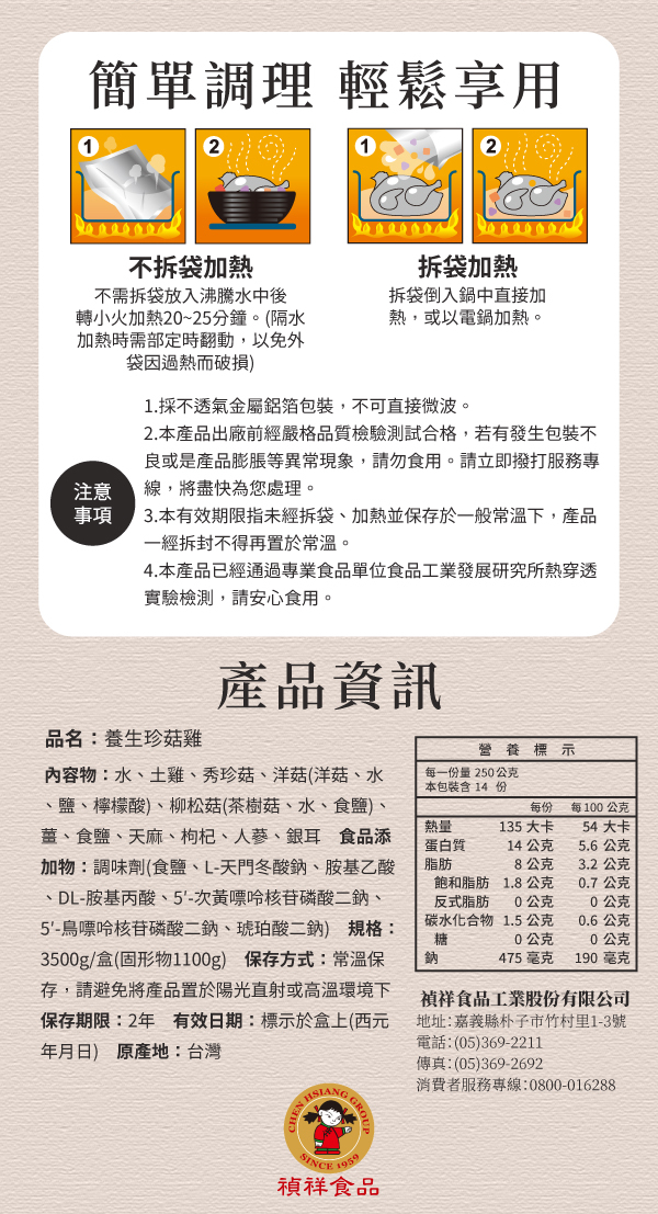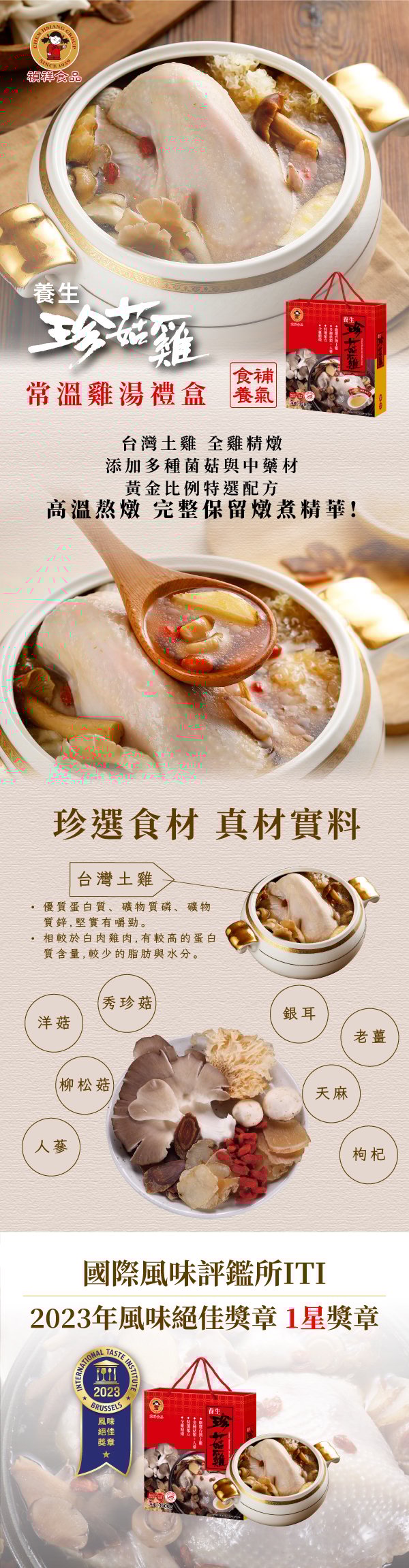 【商品成份】水、土雞、秀珍菇、洋菇(洋菇、水、鹽、檸檬酸)、柳松菇(茶樹菇、水、食鹽)、薑、食鹽、天麻、枸杞、人蔘、銀耳。