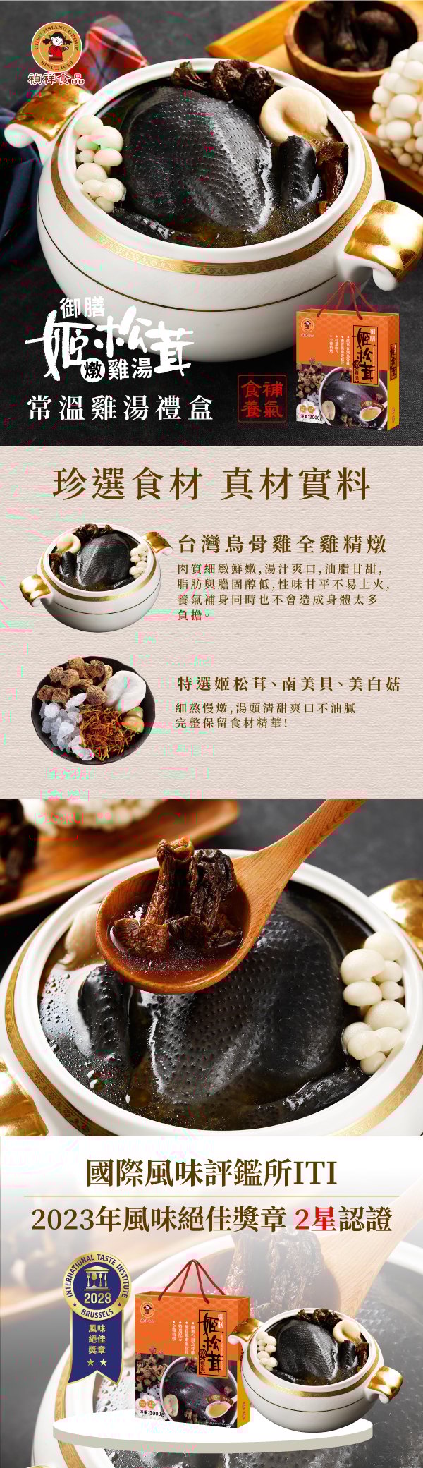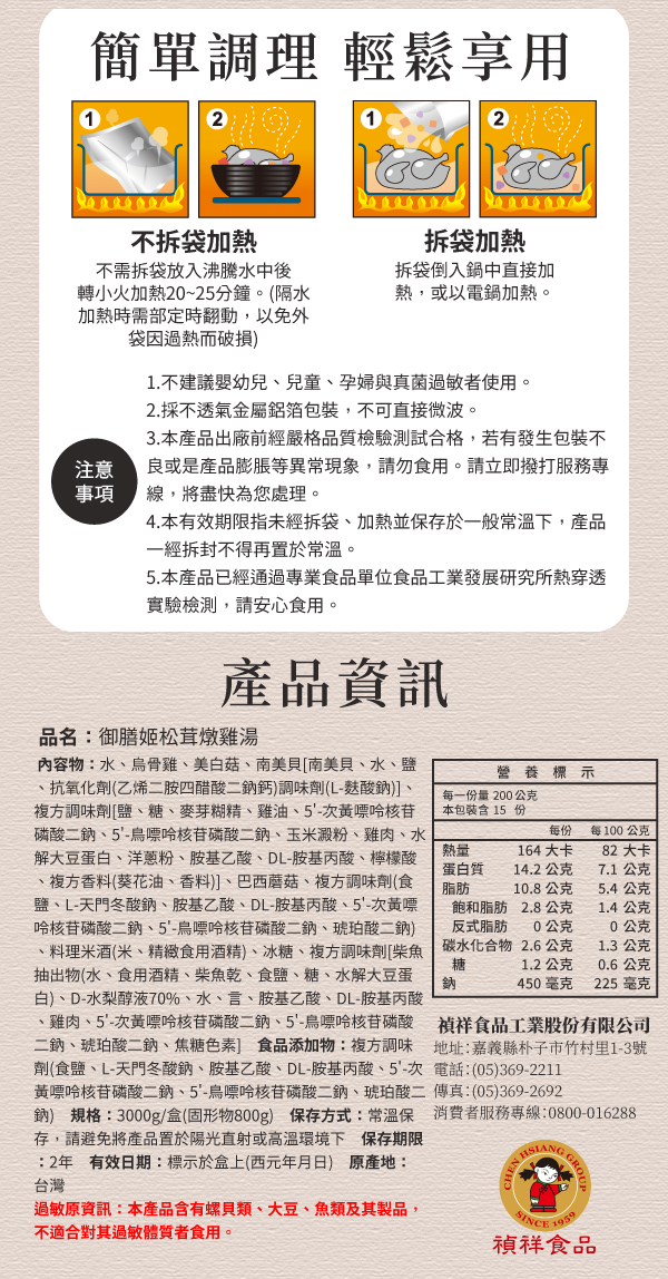 【商品成份】水、冰糖、烏骨雞、巴西蘑菇、美白菇、南美貝[南美貝、水、鹽、抗氧化劑(乙烯二胺四醋酸二鈉鈣)、調味劑(L-麩酸鈉)]、料理米酒(米、精緻食用酒精)。