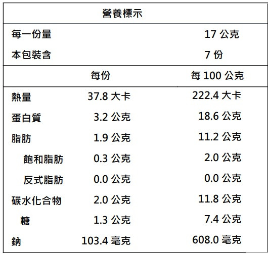 成份:豆干(非基改黃豆、豆腐用凝固劑(硫酸鈣、無水碳酸鈉、消泡劑(脂肪酸甘油脂、碳酸鎂、卵磷脂))、糖、醬油(非基改黃豆、小麥)、馬告、肉桂、花椒、焦糖色素