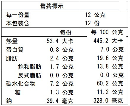 成份:麵粉(小麥麵粉、小麥澱粉)、白油(棕櫚油、抗氧化劑(混合濃縮生育醇))、水、糖、黑胡椒、海苔粉、紅藜、鹽