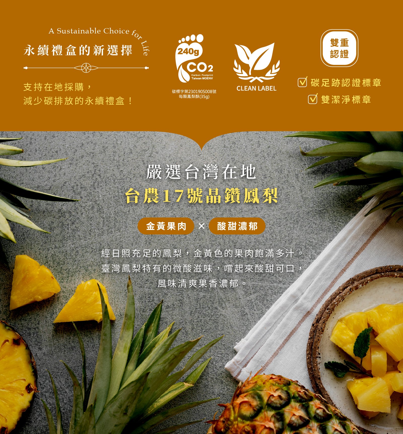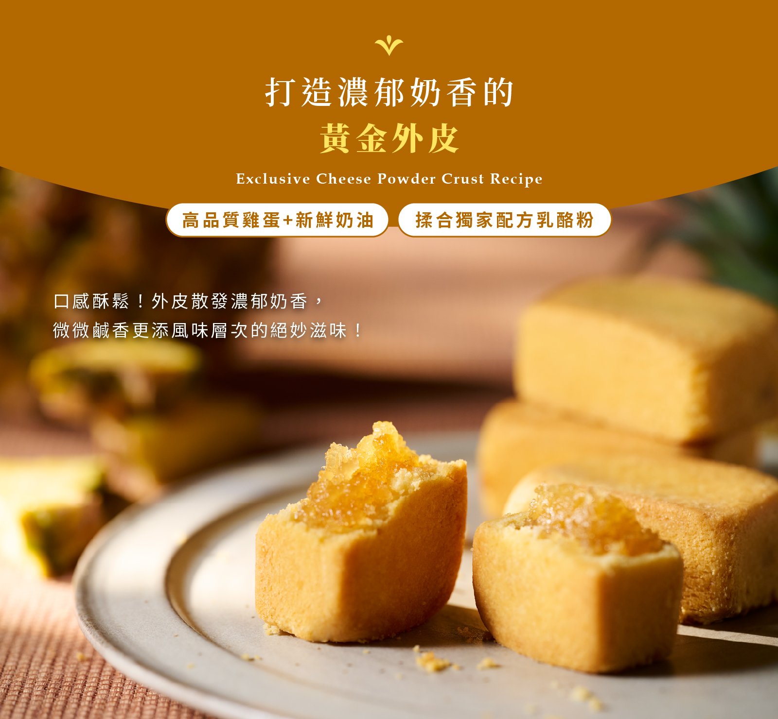 嚴選日照充足的台農17號金鑽鳳梨為底,在入餡前充分研磨細桿鳳梨纖維,混合冬瓜醬做為內餡,滑順綿密香甜可口。外層酥皮使用高品質雞蛋與新鮮奶油拌入,再加上獨家配方乳酪粉,烤出外酥鬆又帶有濃郁奶香,內餡保留恰到好處的濕潤口感。獲得比利時世界食品品鑑大賞銀獎認證,為全年熱賣台灣指定伴手禮。