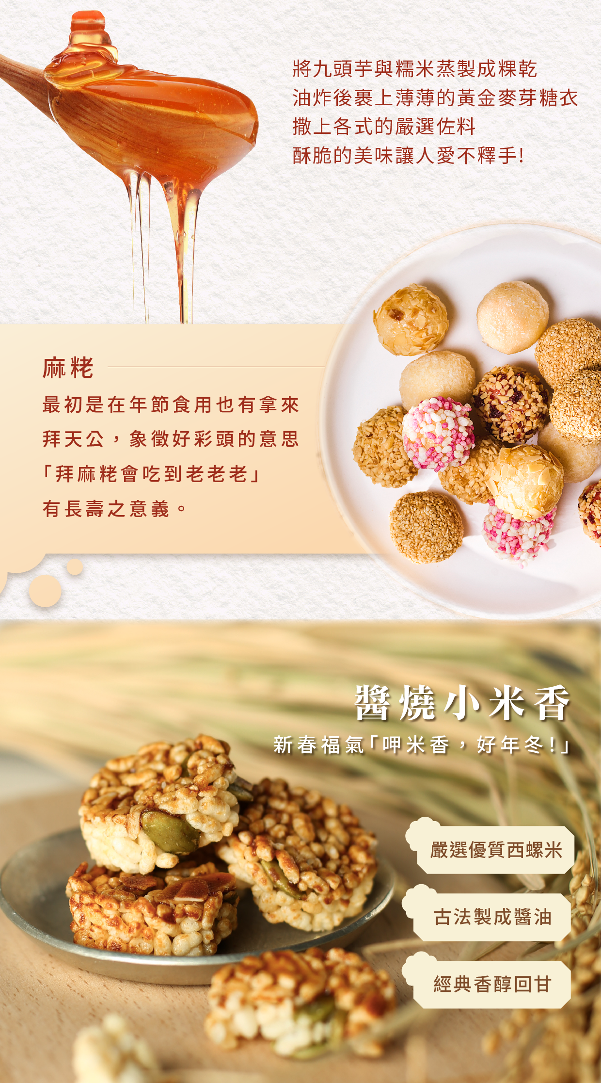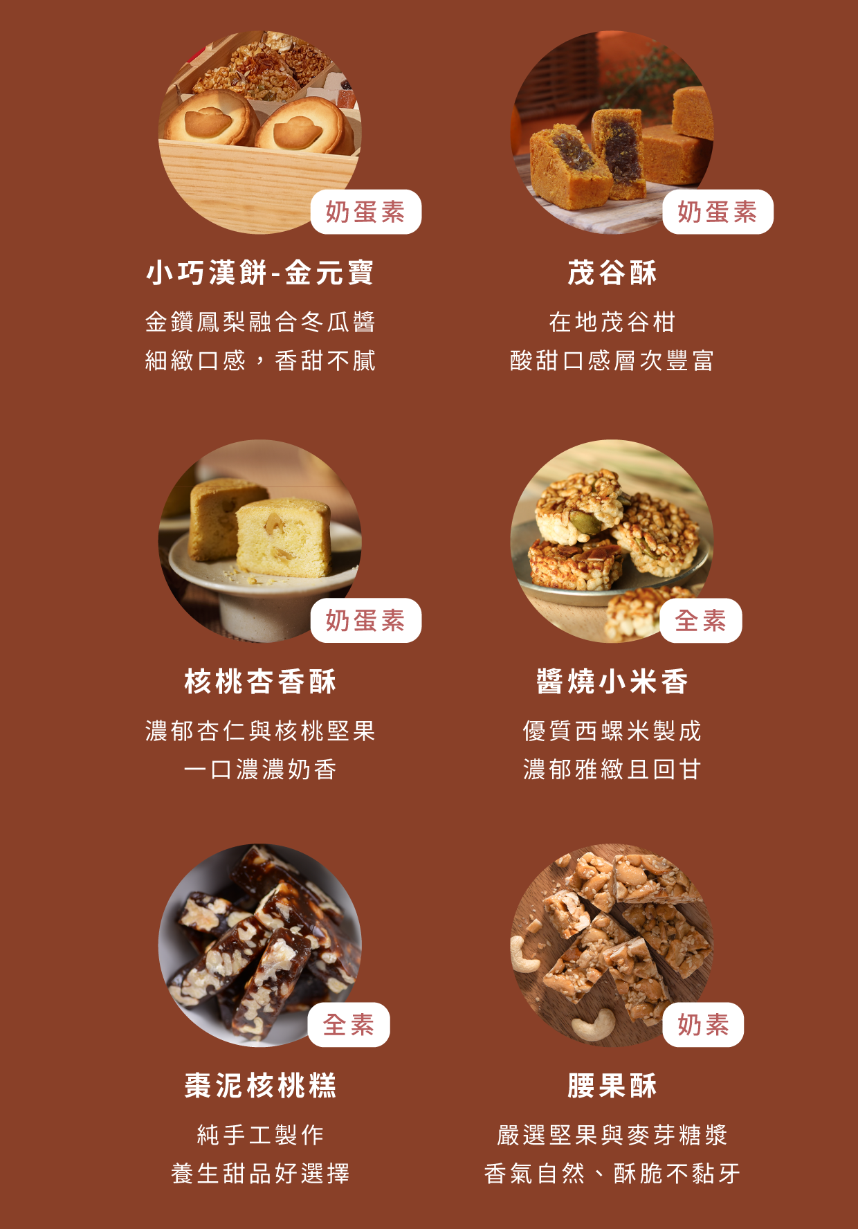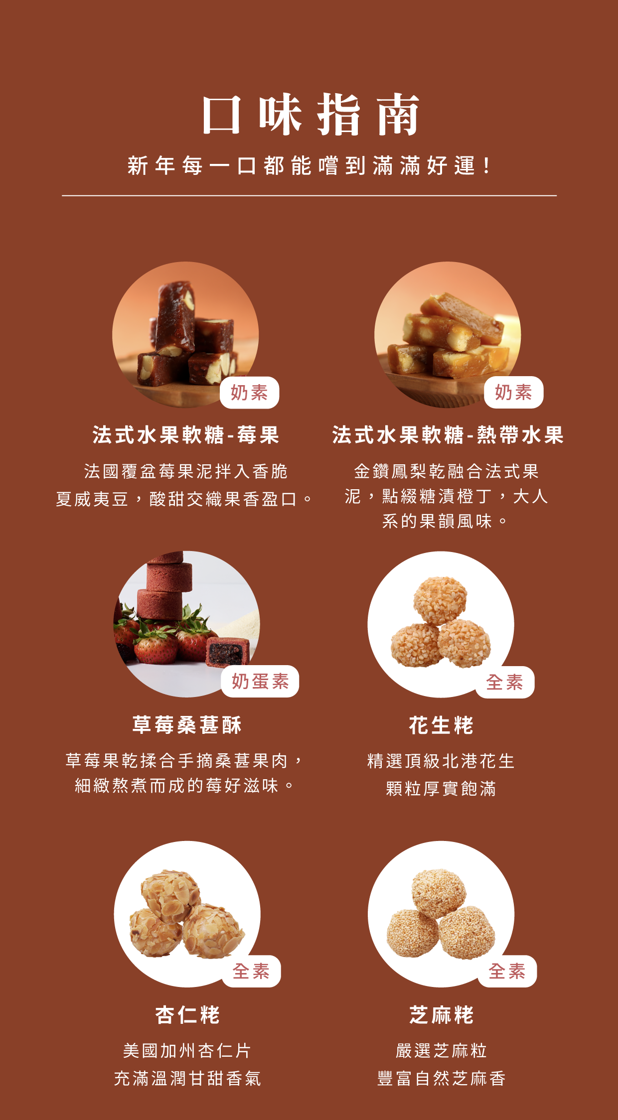 腰果酥(奶素)6入+醬燒小米香(全素)5入+茂谷酥(奶蛋素)2入+核桃杏香酥(奶蛋素)2入+小巧漢餅-金元寶(奶蛋素)2入+法式水果軟糖-莓果(奶素)3入+法式水果軟糖-熱帶水果(奶素)3入+草莓桑葚酥(奶蛋素)2入+棗泥核桃糕(全素)8入+花生粩(全素)6入+杏仁粩(全素)6入+芝麻粩(全素)6入+春節禮盒專用提袋1只。
