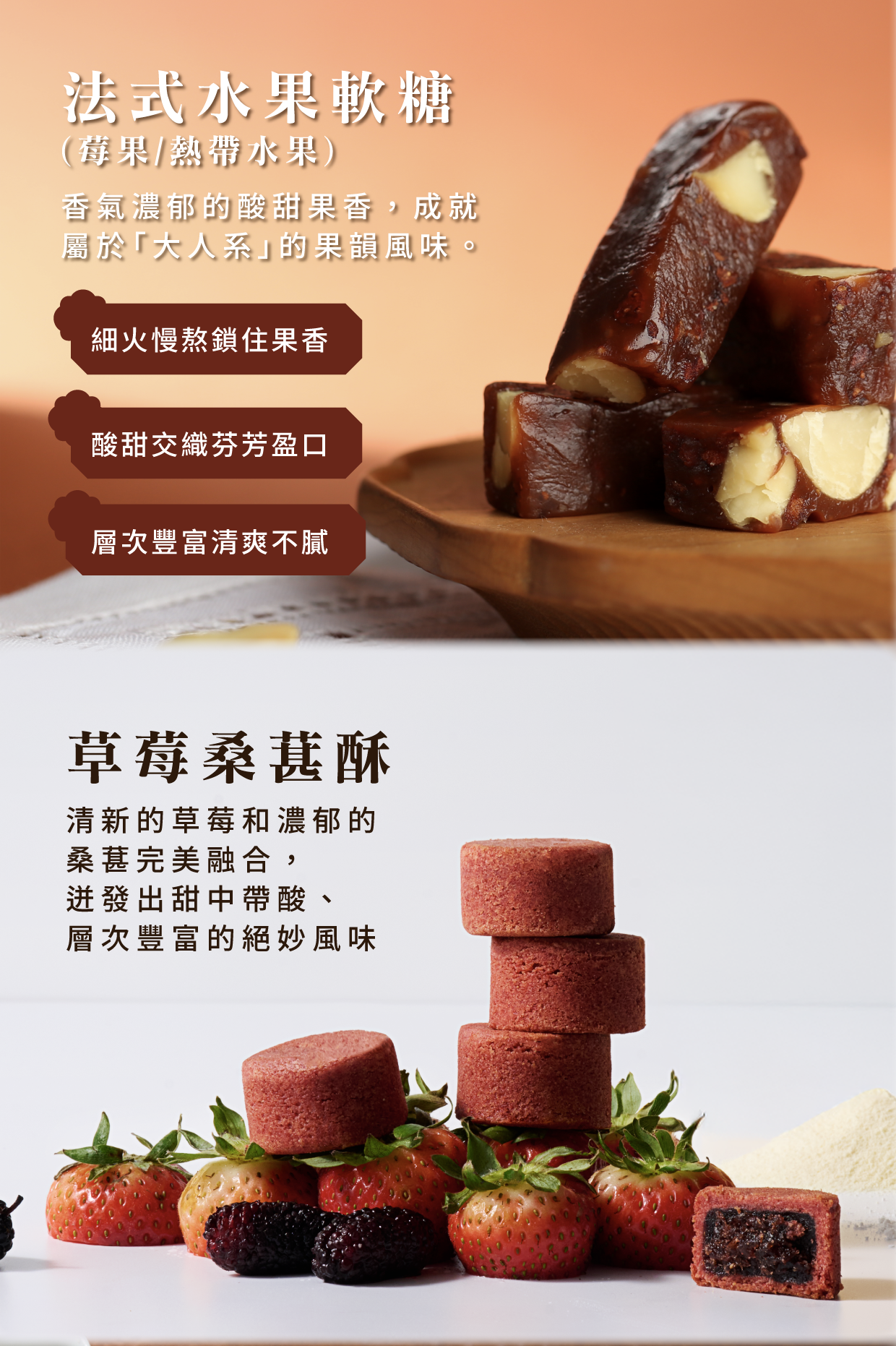 .部分產品含麩質之穀物、牛奶、蛋、花生、堅果類、芝麻、大豆、亞硫酸鹽類、種子類及其製品。 .本產品生產製程廠房,其設備或管線有處理甲殼類、芒果,食物過敏者請留意。 .【法式水果軟糖-熱帶水果】製程加入酒精,經揮發仍可能微量殘留。孕婦、兒童、酒精敏感者請留意。 .本禮盒內容物若非底盒標示所列之商品,表示為訂購者特殊要求之產品。