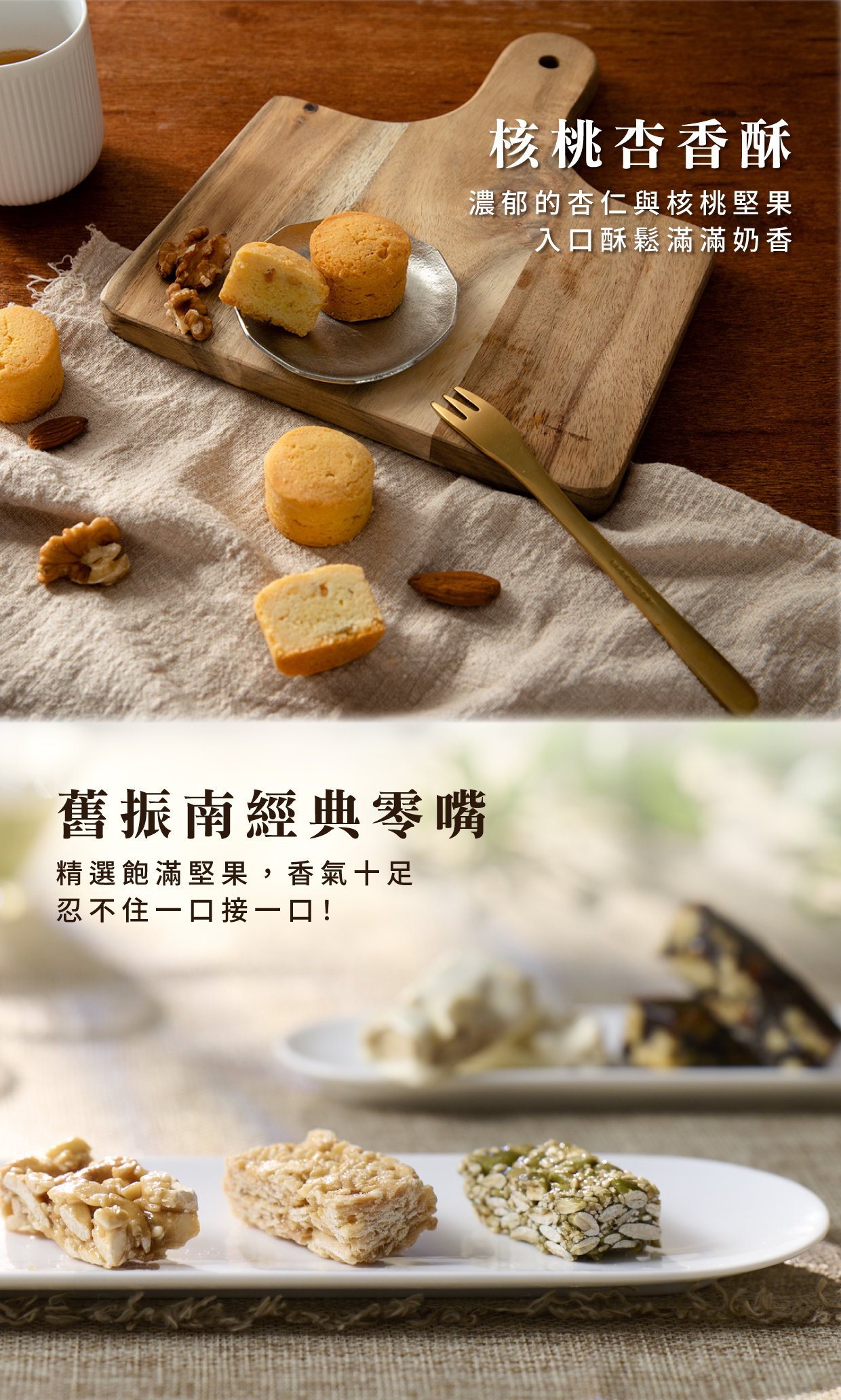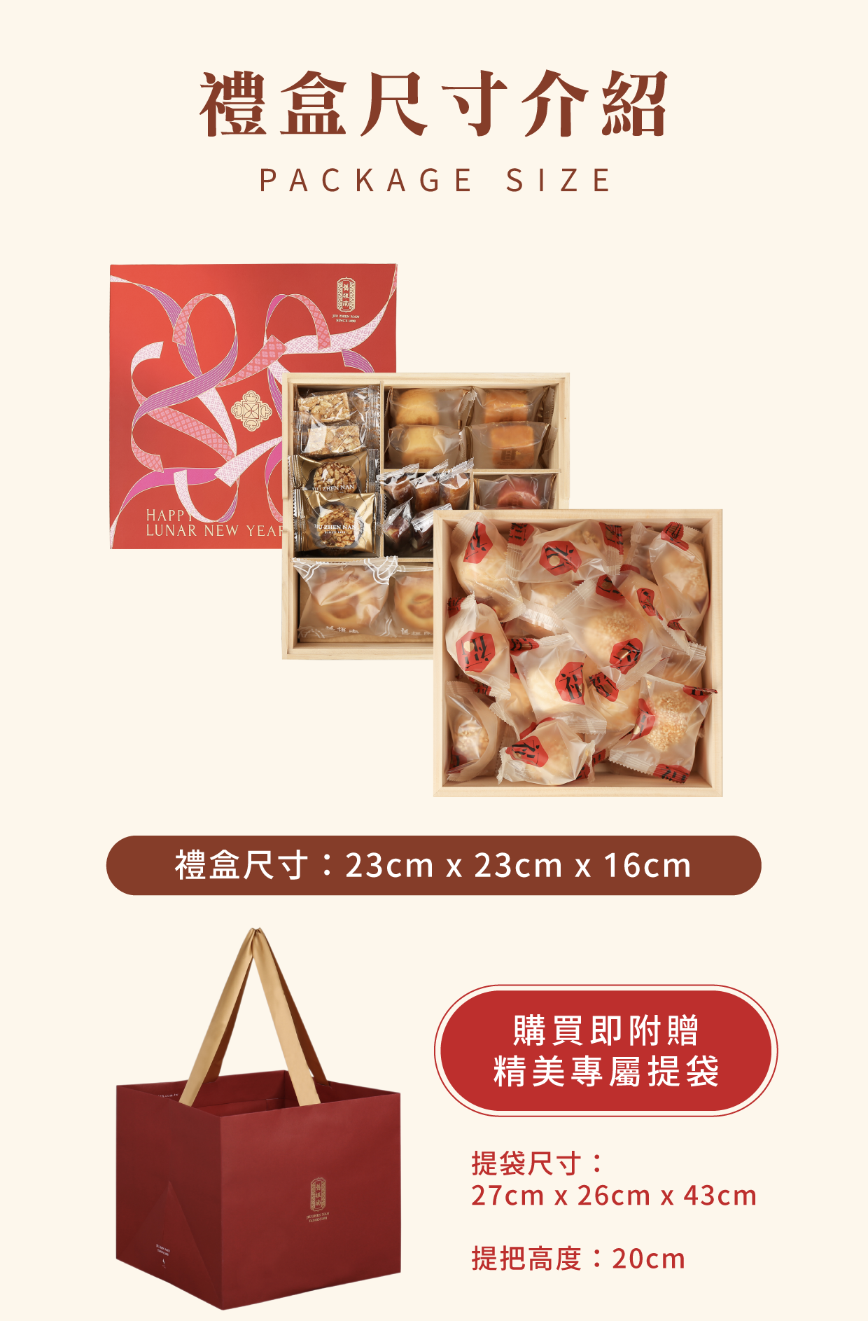腰果酥6g/入*6+醬燒小米香4.2g/入*5+茂谷酥20g/入*2+核桃杏香酥18g/入*2+小巧漢餅-金元寶45g/入*2+法式水果軟糖-莓果12g/入*3+法式水果軟糖-熱帶水果12g/入*3+草莓桑葚酥18g/入*2+棗泥核桃糕10g/入*8+花生粩13g/入*6+杏仁粩11g/入*6+芝麻粩11g/入*6+春節禮盒專用提袋 (1只)。
