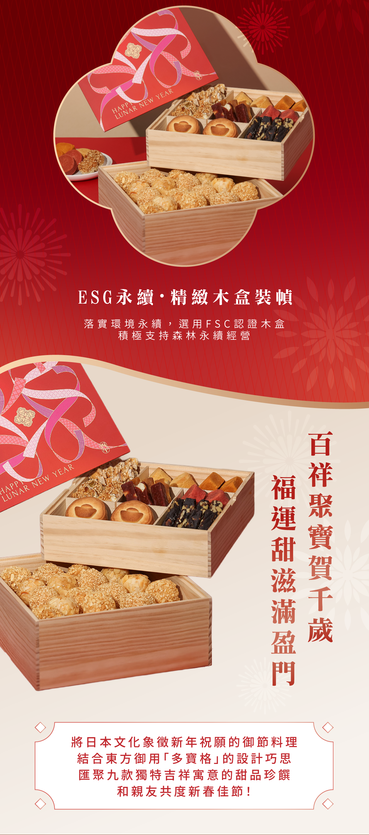 結合源於日本文化象徵新年祝願的御節料理;以及東方御用「多寶格」亦稱「百什件」的設計巧思,匯聚九款乘載獨特吉祥寓意的甜品珍饌,伴隨團聚歡笑聲,共度新春佳節!