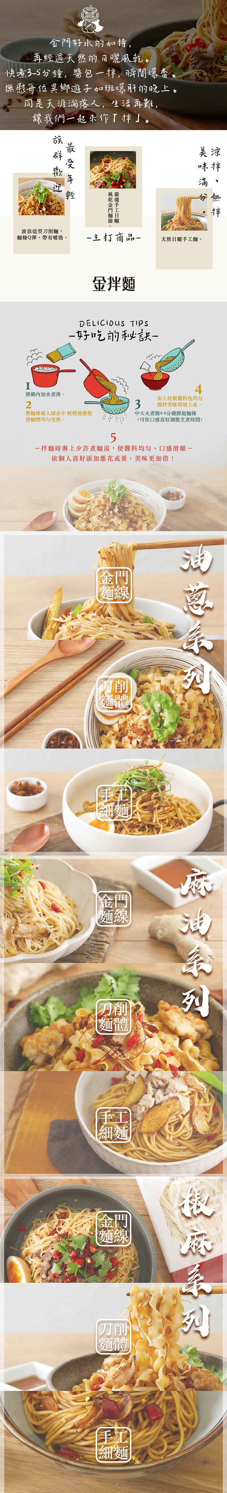•金拌麵【私房麻油口味】手工麵120公克x1 麵(小麥麵粉、水、鹽)、純釀造醬包(醬汁、水、鹽、糖、調味劑(L-麩酸鈉、5`-次黃嘌呤核苷磷酸二鈉、5`-鳥嘌呤核苷磷酸二鈉)、著色劑(焦糖色素)、甜味劑(醋磺內酯鉀)、麻油(大豆色拉油)、抗氧化劑 (混和濃縮生育醇、大豆色拉油)