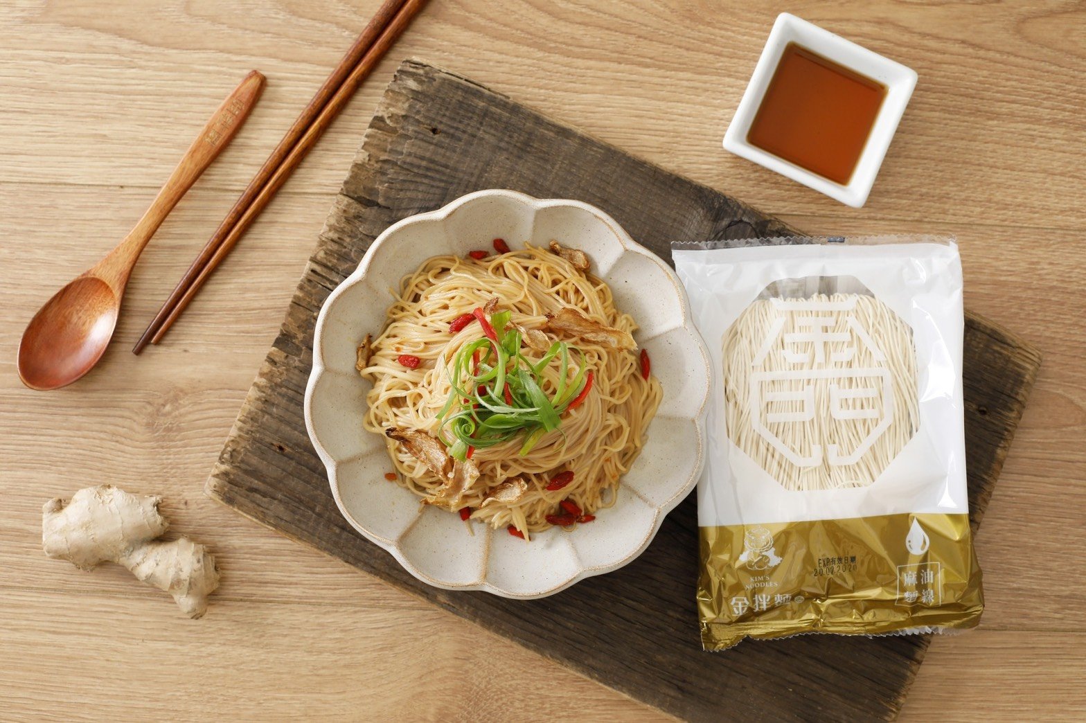 •金拌麵【經典油蔥口味】手工麵120公克x1 麵(小麥麵粉、水、鹽)、純釀造醬包(醬汁、水、鹽、糖、調味劑(L-麩酸鈉、5`-次黃嘌呤核苷磷酸二鈉、5`-鳥嘌呤核苷磷酸二鈉)、著色劑(焦糖色素)、甜味劑(醋磺內酯鉀)、蔥油(大豆色拉油)、抗氧化劑(混和濃縮生育醇、大豆色拉油)