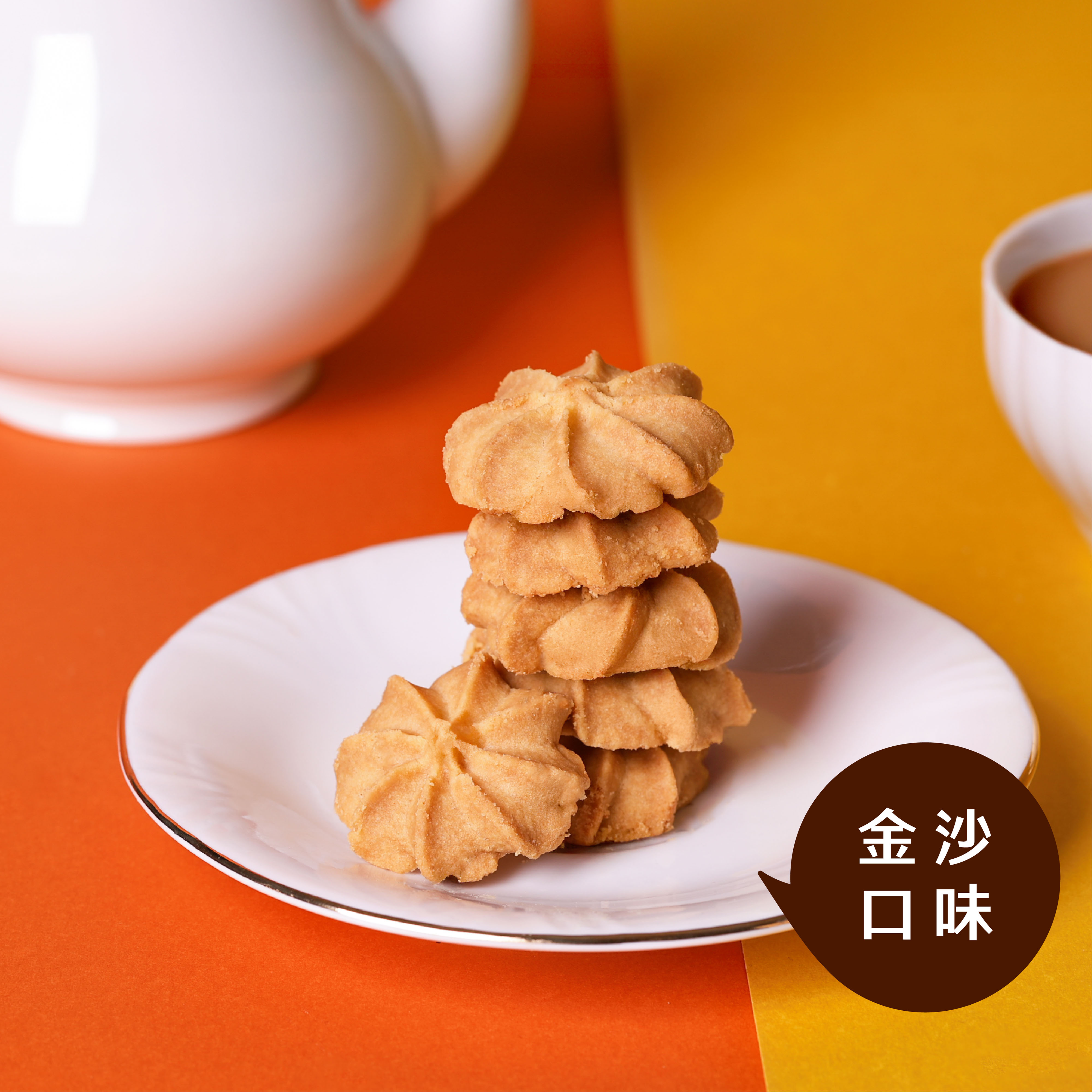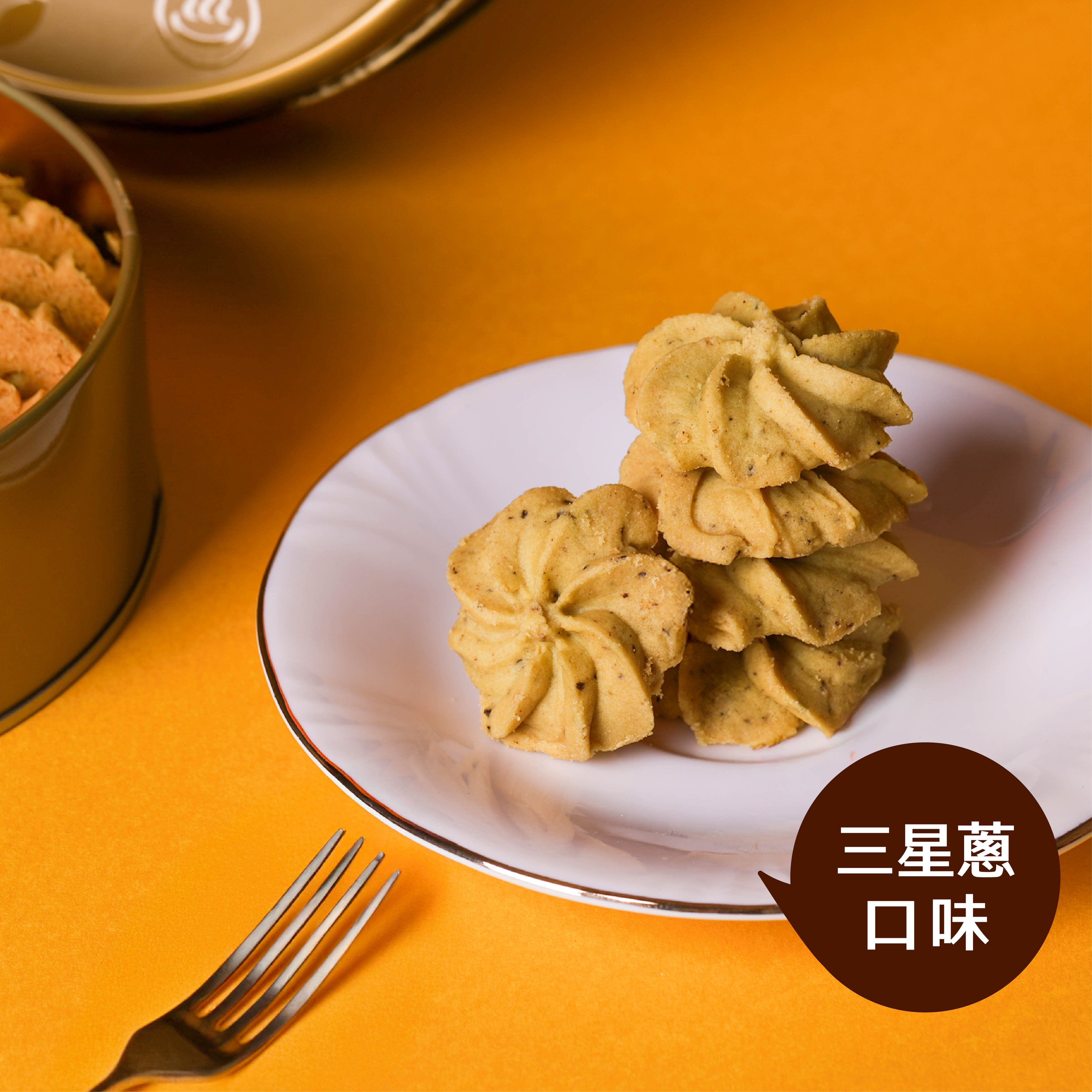 金沙口味嚴選鹹蛋黃入料,烘烤後散發濃郁奶香與細緻鹹香,入口酥鬆綿密,尾韻帶著迷人的蛋黃餘韻;三星蔥口味則選用宜蘭在地三星蔥,烘焙後釋放淡雅蔥甜與自然清香,與曲奇的酥鬆口感完美融合,越吃越涮嘴。