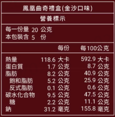 [金沙口味] 低筋麵粉(小麥) 、高筋麵粉(小麥)、玉米澱粉(基因改造)、全脂乳粉、無鹽奶油(乳脂、乳酸菌、乳酸濃縮物)、糖粉(糖、食用樹薯澱粉)、岩鹽〔氯化鈉、亞鐵氰化鉀(品質改良劑)〕、金沙風味粉〔蛋黃粉、奶精(硬質棕櫚油、棕櫚油、葡萄糖漿、乳清蛋白、麥芽糊精、酪蛋白鈉、乳糖、麵粉、檸檬酸鉀、乳酸、脂肪酸甘油酯)、全蛋粉、麥芽糊精、酵母萃取物(酵母萃取物、鹽)、香料、紅椒色素(芥花油、辣椒萃取物)、β-胡蘿蔔素(麥芽糊精、辛烯基丁二酸鈉澱粉、葵花油、抗氧化劑(L-抗壞血酸鈉、維生素C、維生素E)、β-胡蘿蔔素〕