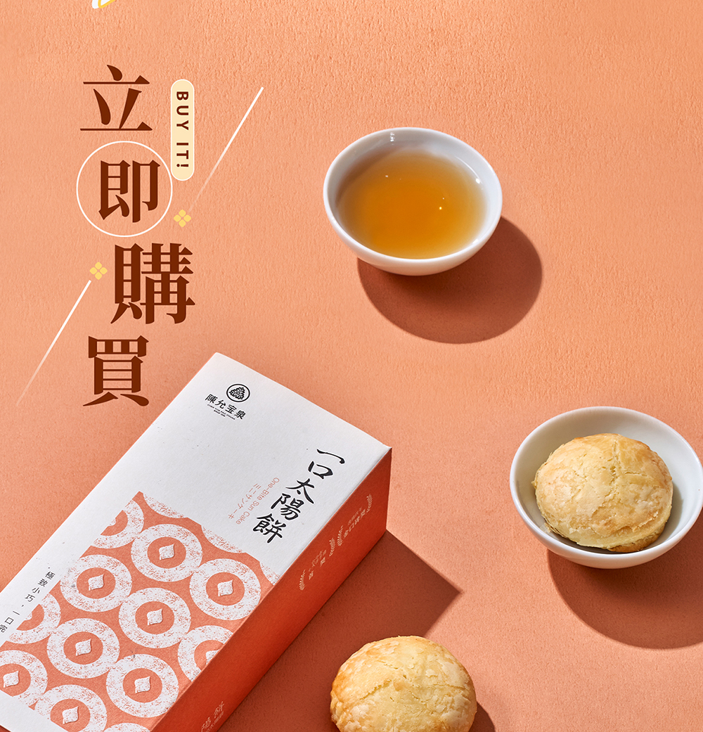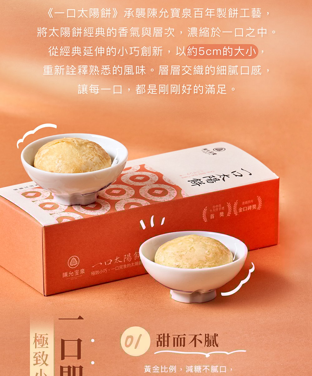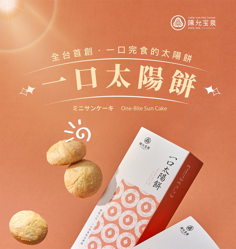• 來自台中百年糕餅品牌陳允寶泉的最新力作——「一口太陽餅」,以精緻迷你的尺寸重新演繹經典太陽餅風味。延續百年傳承的烘焙工藝與選料堅持,採用紐西蘭奶油取代傳統豬油,口感酥鬆香甜、餘韻溫潤。