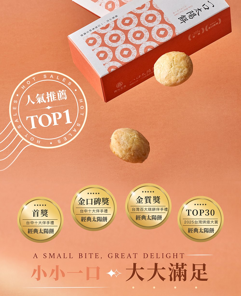 •榮獲【台灣百大伴手禮】與【台灣烘焙大賞 TOP30】等多項殊榮,象徵「台中太陽餅」的極致代表,也展現台灣傳統糕點的全新面貌。