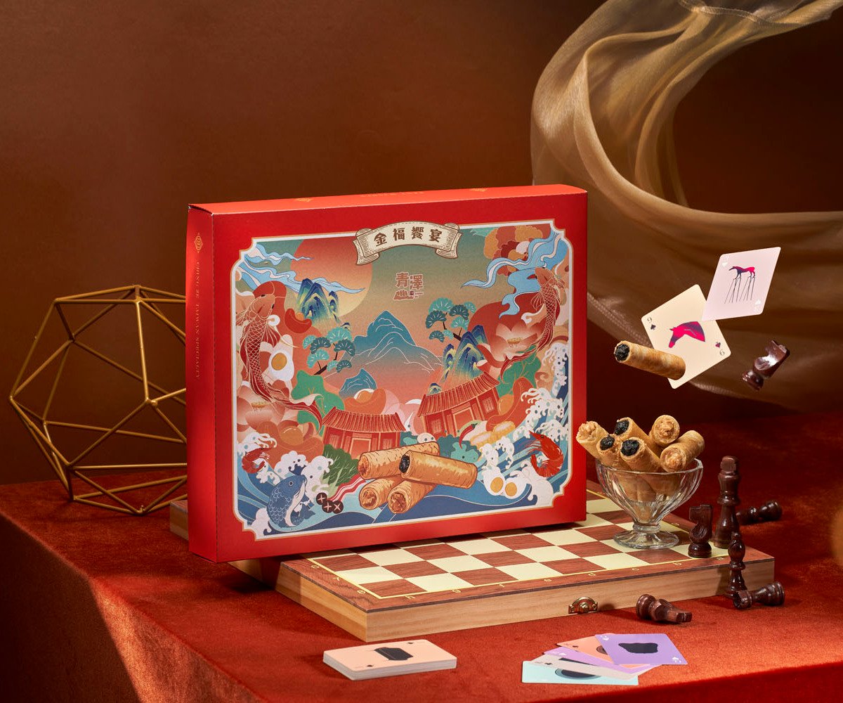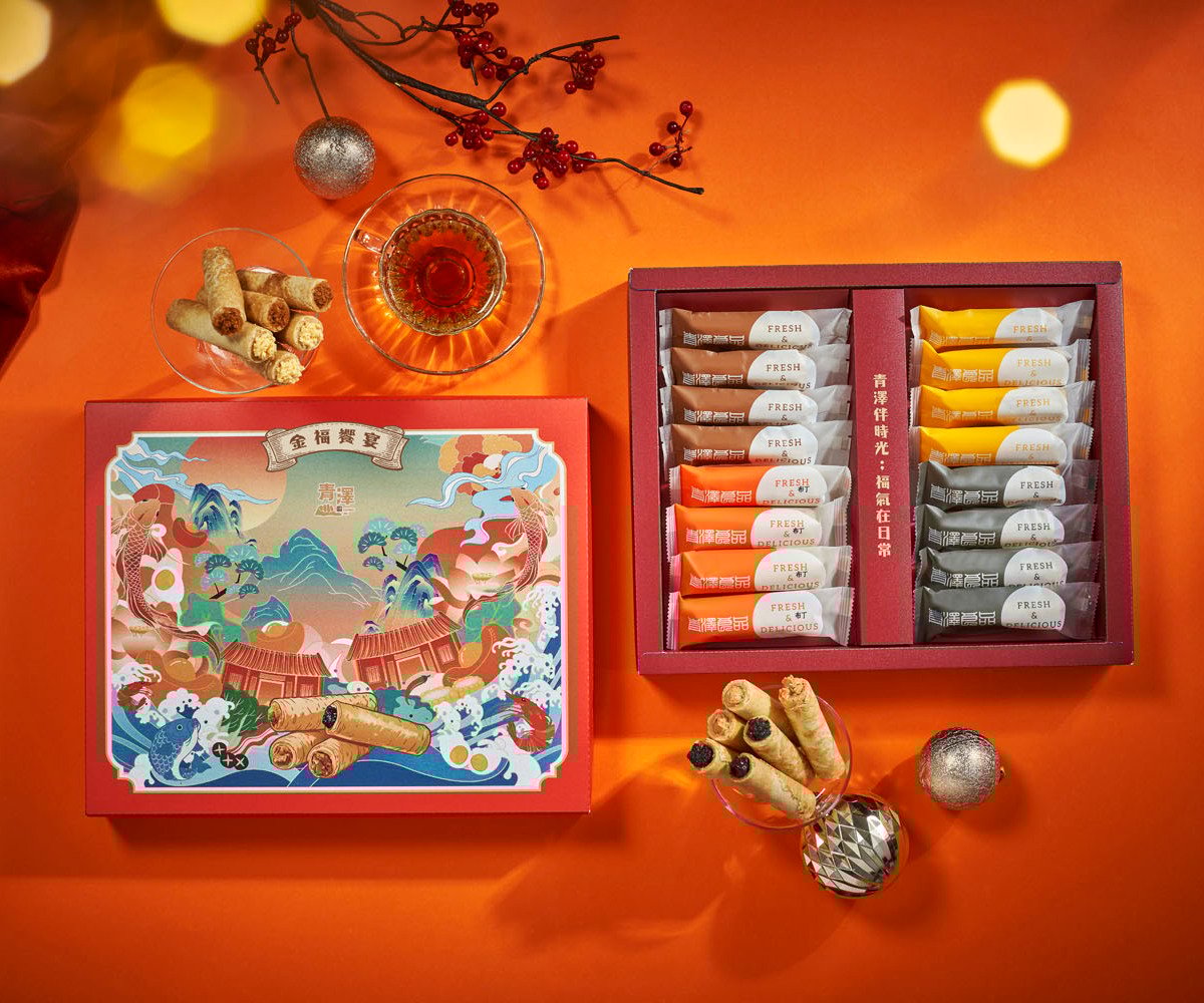 以「金運到、福氣來」為概念發想的金福饗宴系列,選用最受喜愛的四款人氣醬心蛋捲,甜鹹並陳、香氣各有所長。象徵新年「四季順心」、好運從各方匯集而來,紅金交織的質感包裝,象徵新年好兆頭—福份成雙、好運倍增。無論是企業贈禮、親友送禮或家庭共享,都體面又大方。