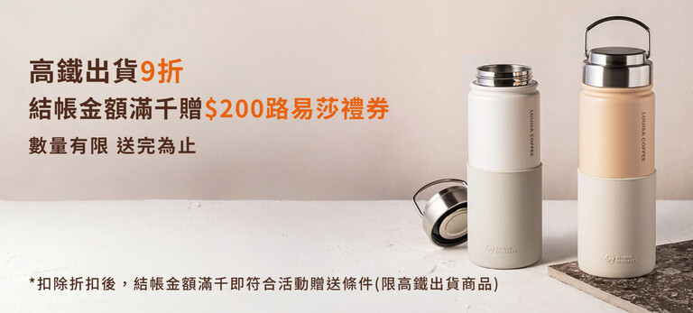 高鐵出貨商品限時9折 ! *購物車結帳金額滿$1,000,加贈路易莎咖啡商品禮券$100*2張。