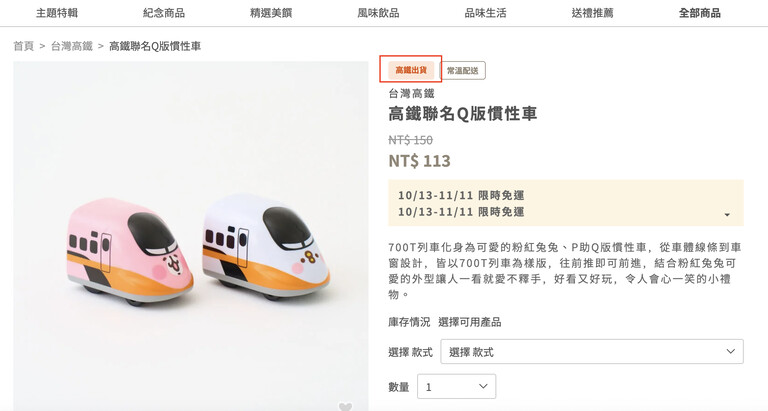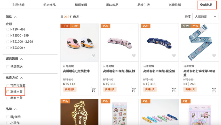 A:可參考商品頁上,有標示『高鐵出貨』標籤 (如下圖一);或是直接至【全部商品頁】,出貨方式篩選為『高鐵出貨』(如下圖二)