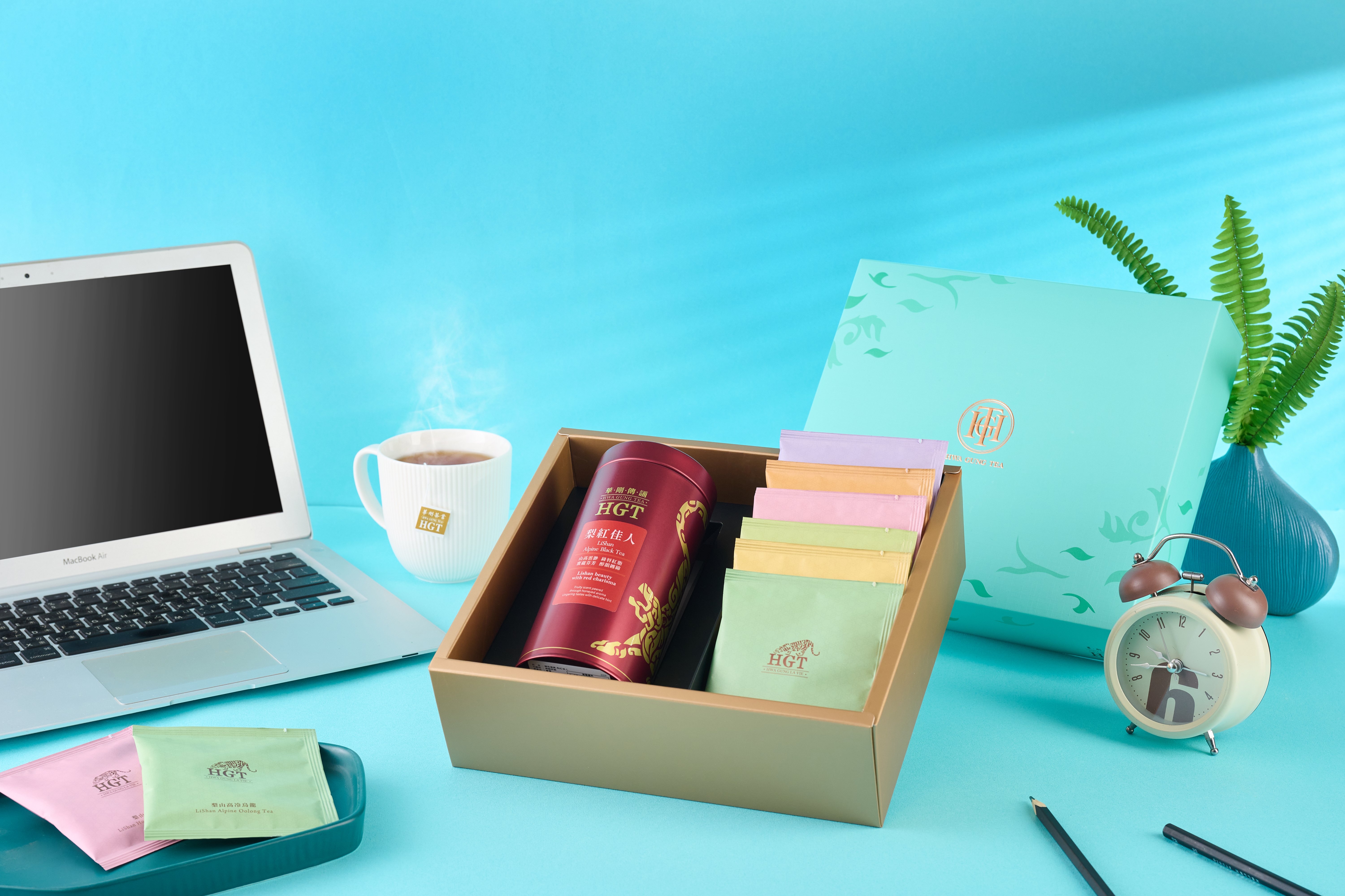 由百年職人HGT華剛茶業,嚴選6款臺灣莊園茶包,搭配一罐榮獲法國AVPA金獎,帶有高山花香與熟果甜韻的梨山紅茶,一個組合多重享受。