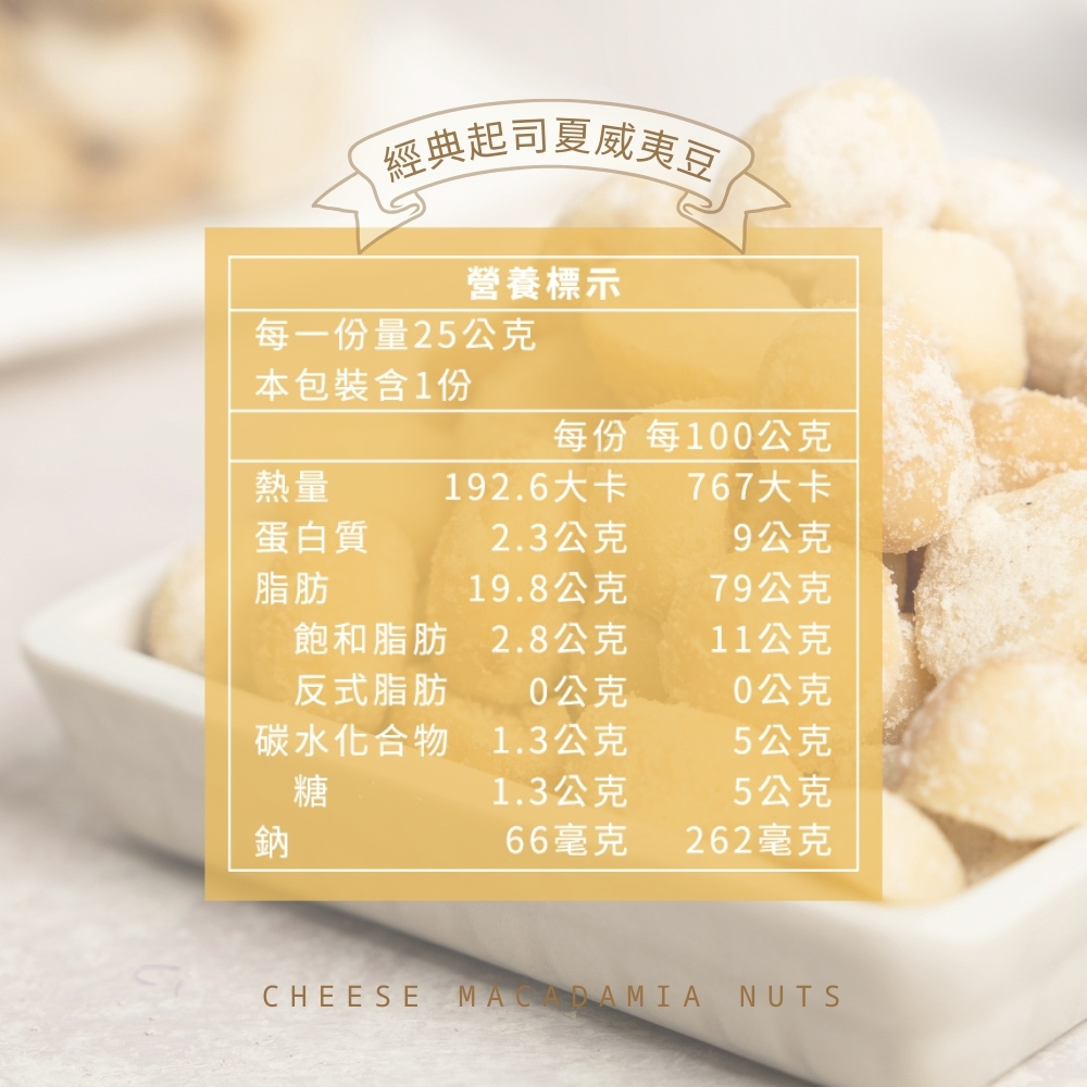 成份:夏威夷豆、起士粉[乾酪(牛奶、鹽、乾酪菌、凝乳酵素)、乳固形物、檸檬酸]、奶粉、棕櫚油、糖、鹽(鹽、亞鐵氰化鉀)、洋葱粉、昆布抽取物、抗氧化劑-維生素E(混合濃縮生育醇、芥花籽油)