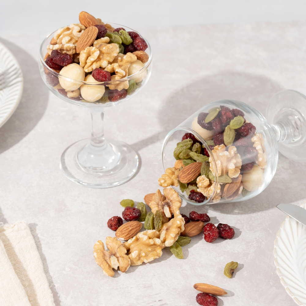 成份:夏威夷豆、杏仁、蔓越莓切片(蔓越莓、蔗糖、葵花油)、核桃、青提子(葡萄乾)、南瓜子、枸杞